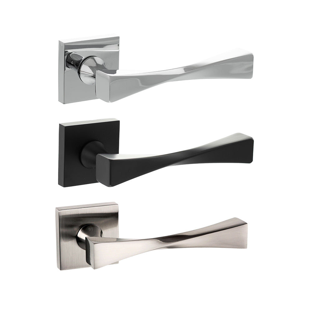 The Atlantic SP190 Senza Pari Guido on Square Rose Door Handle Pack is a modern internal door handle set featuring a sleek lever design mounted on a square rose. It offers a contemporary, architectural look that suits modern and minimalist interiors.